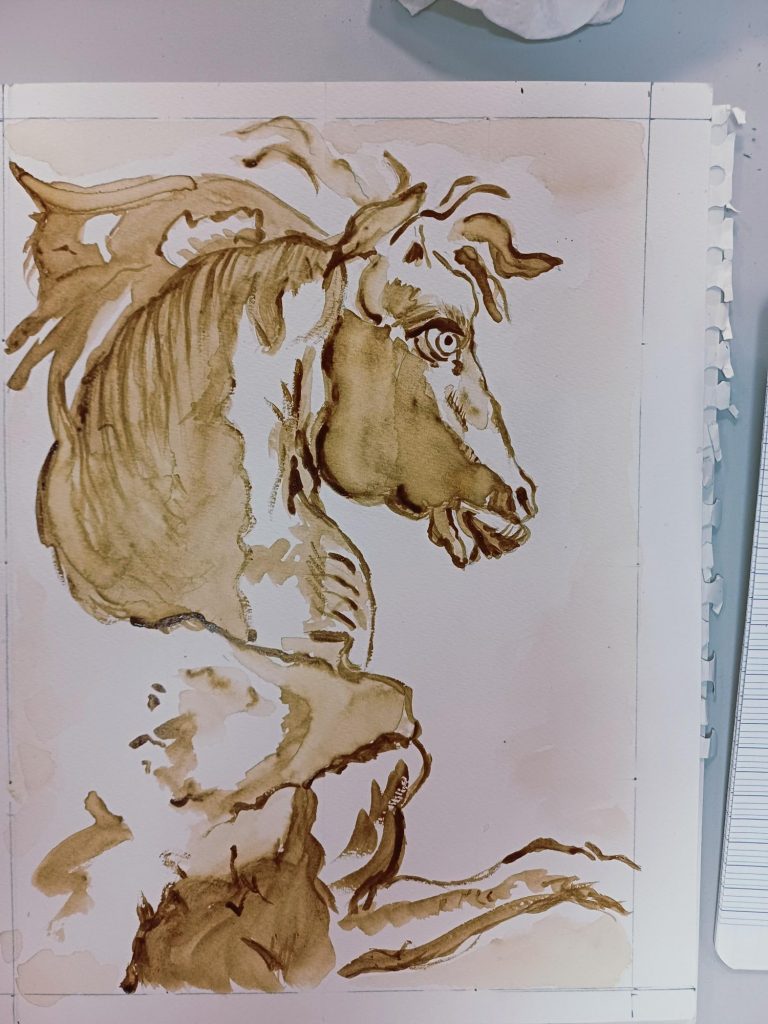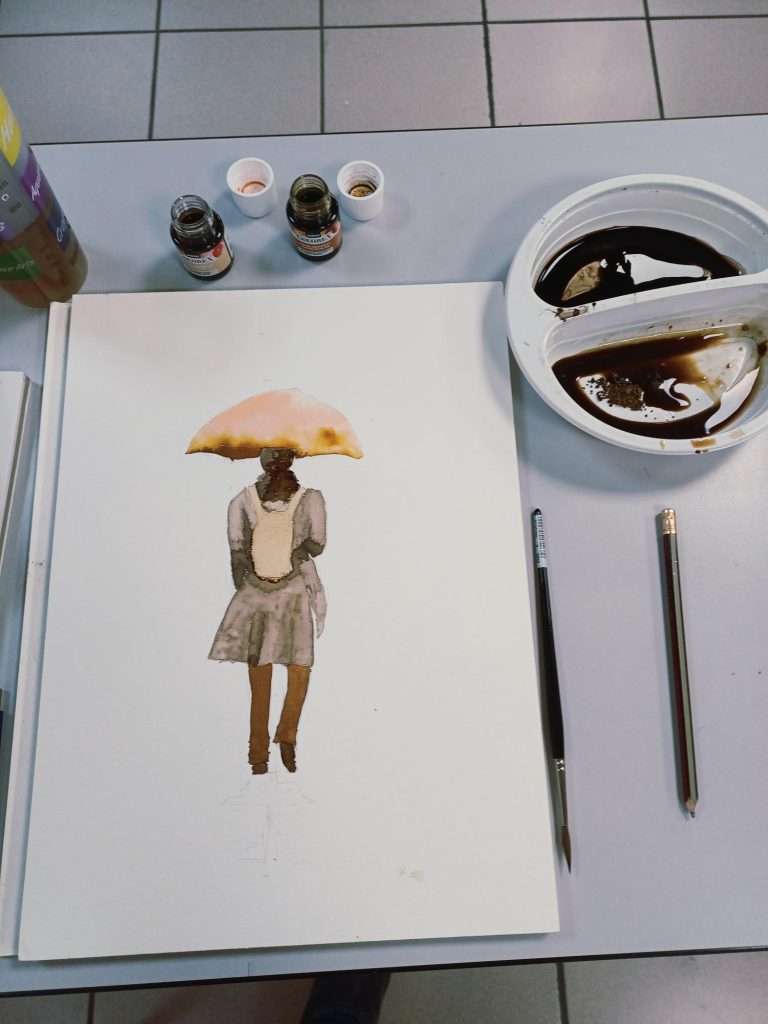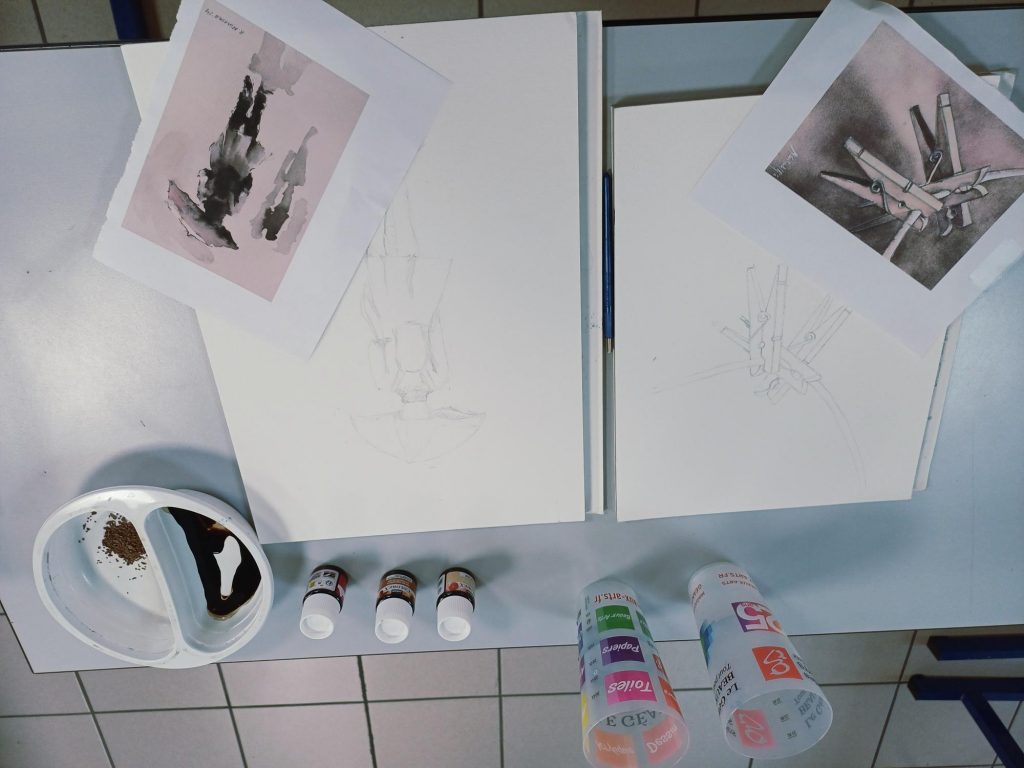 Vendredi 12 décembre 2025, nous avons essayé la peinture au café, brou de noix, encres et autres.