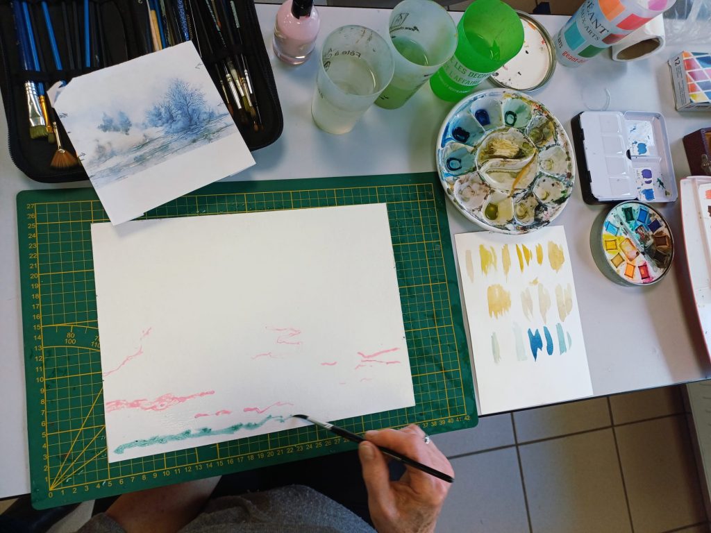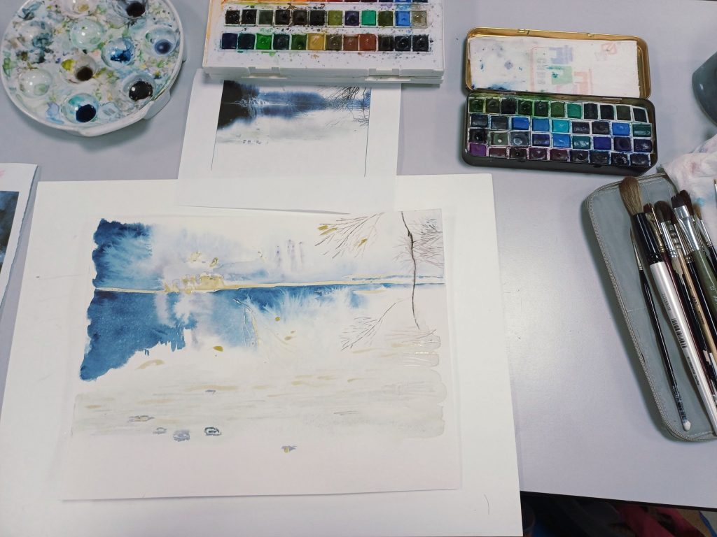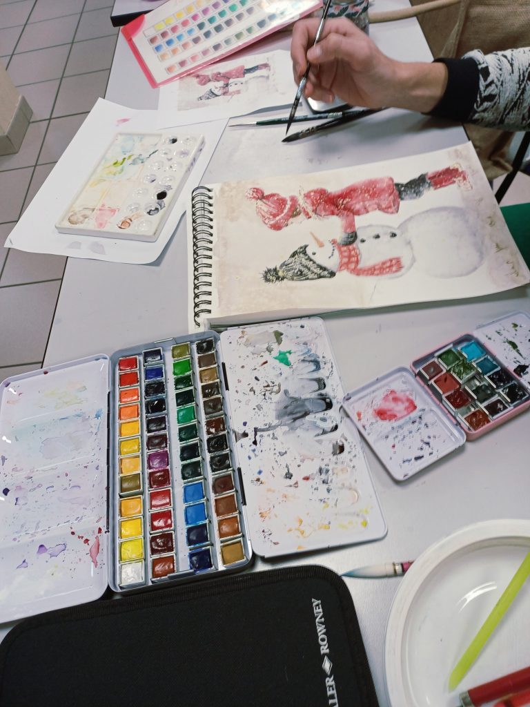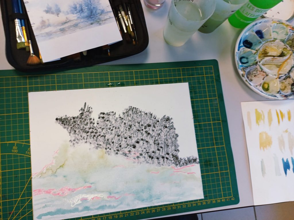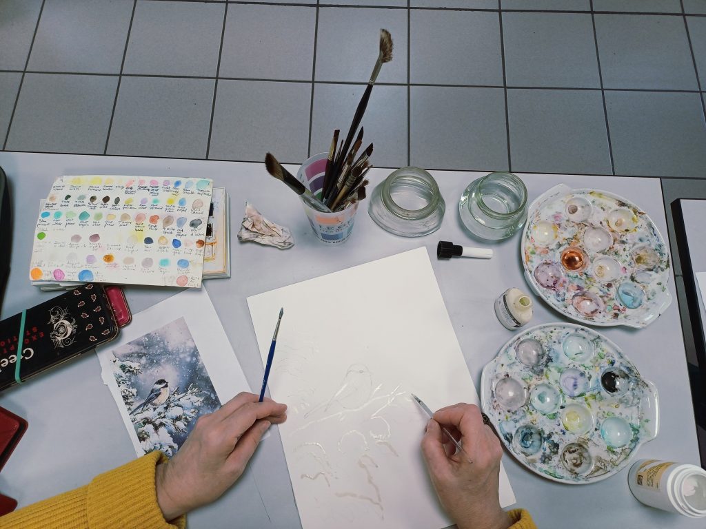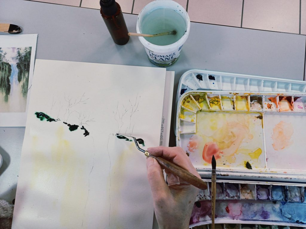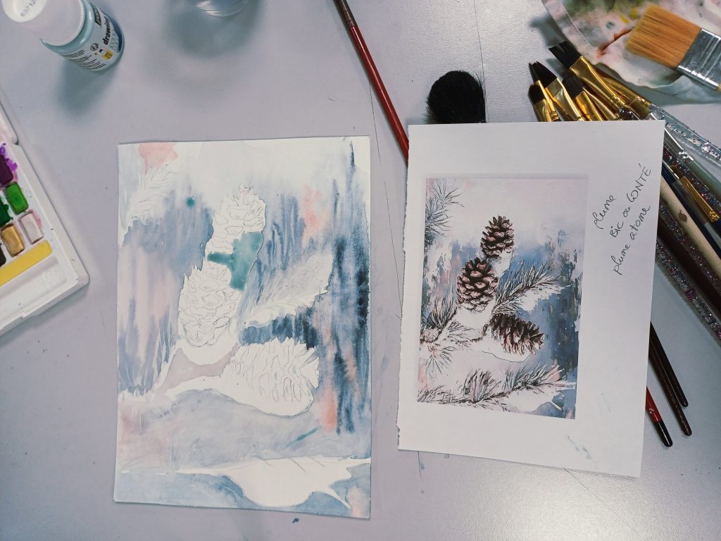 Vendredi 9 janvier 2026, le thème de l’atelier était le Drawing Gum. Nous avons employé cette technique pour préserver les blancs de l’aquarelle. Un travail réalisé par étape : dessin, pose du drawing gum à la plume ou au pinceau, temps de séchage, peinture à l’aquarelle, retrait du drawing gum, finalisation de l’aquarelle.