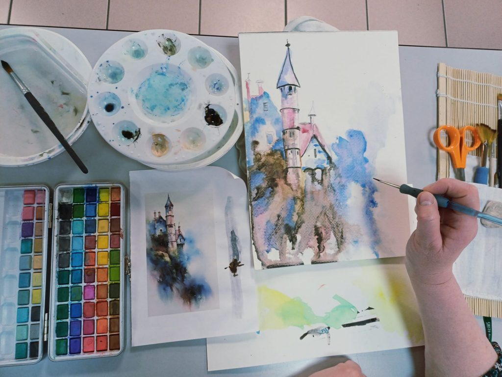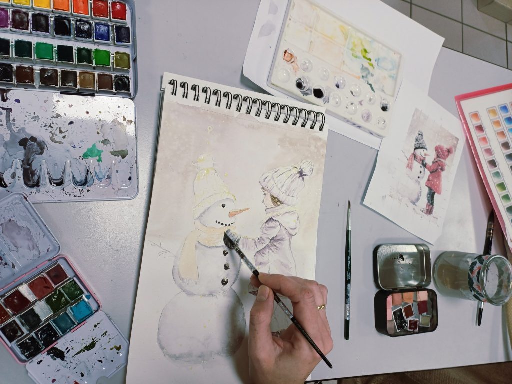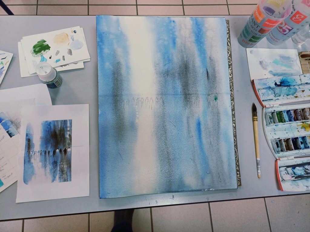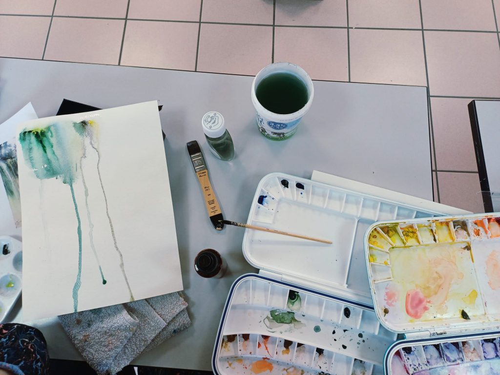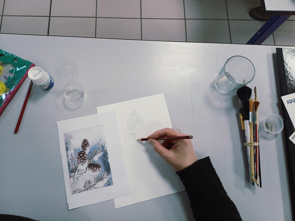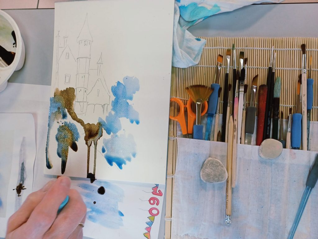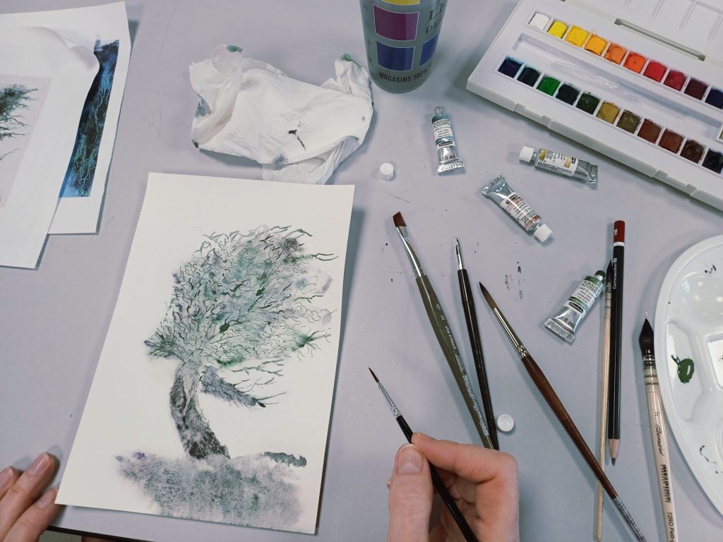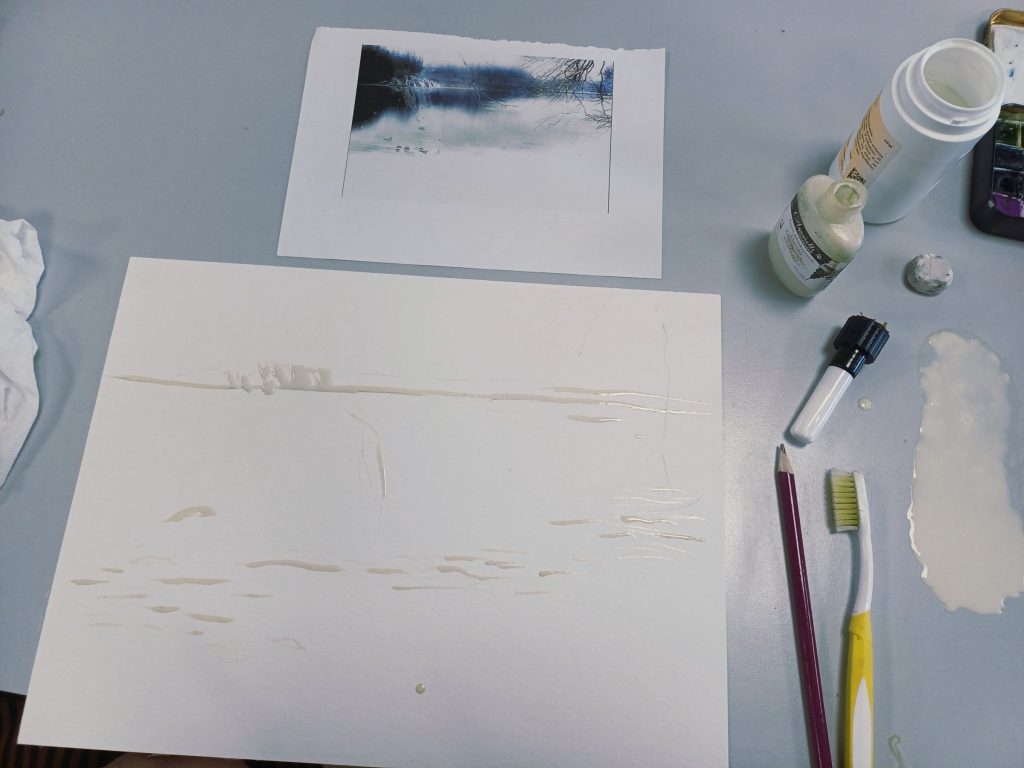 Vendredi 9 janvier 2026, le thème de l’atelier était le Drawing Gum. Nous avons employé cette technique pour préserver les blancs de l’aquarelle. Un travail réalisé par étape : dessin, pose du drawing gum à la plume ou au pinceau, temps de séchage, peinture à l’aquarelle, retrait du drawing gum, finalisation de l’aquarelle.
