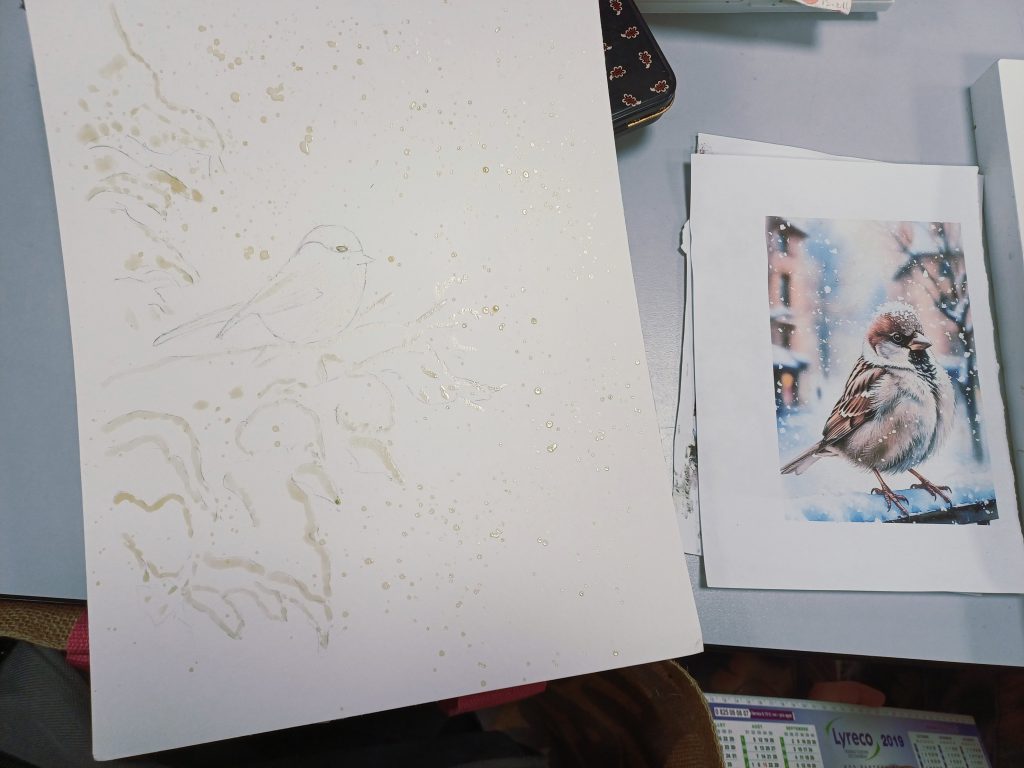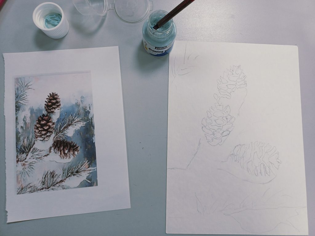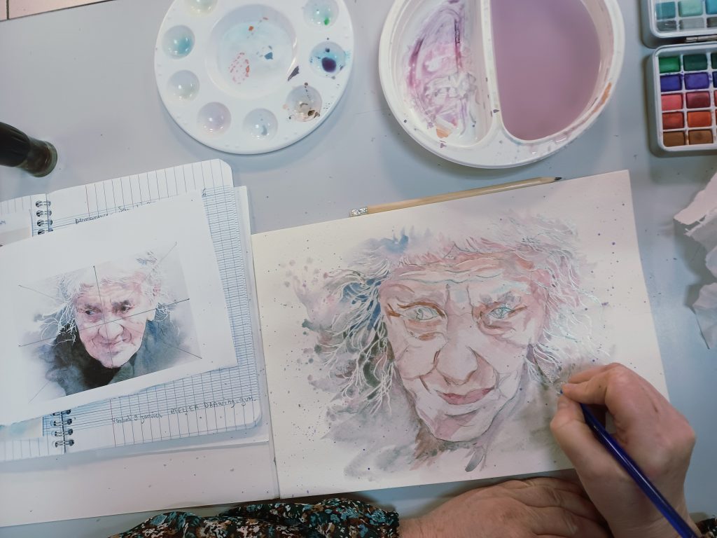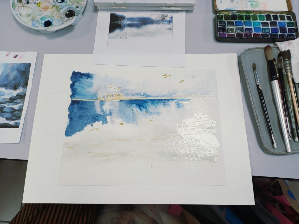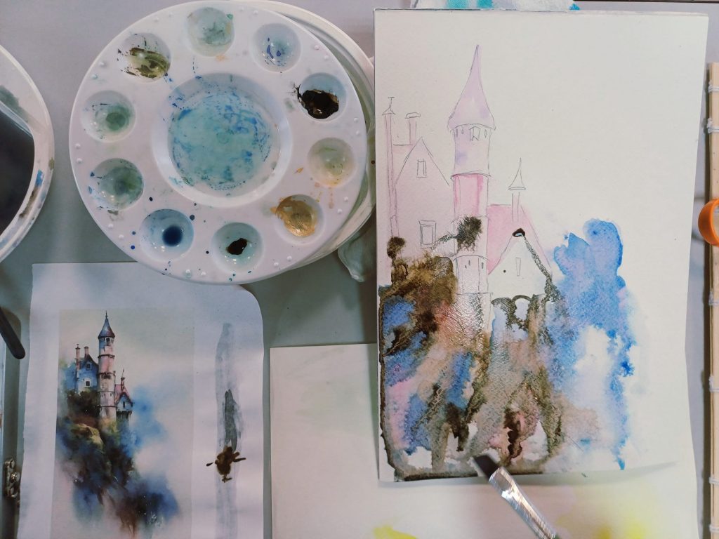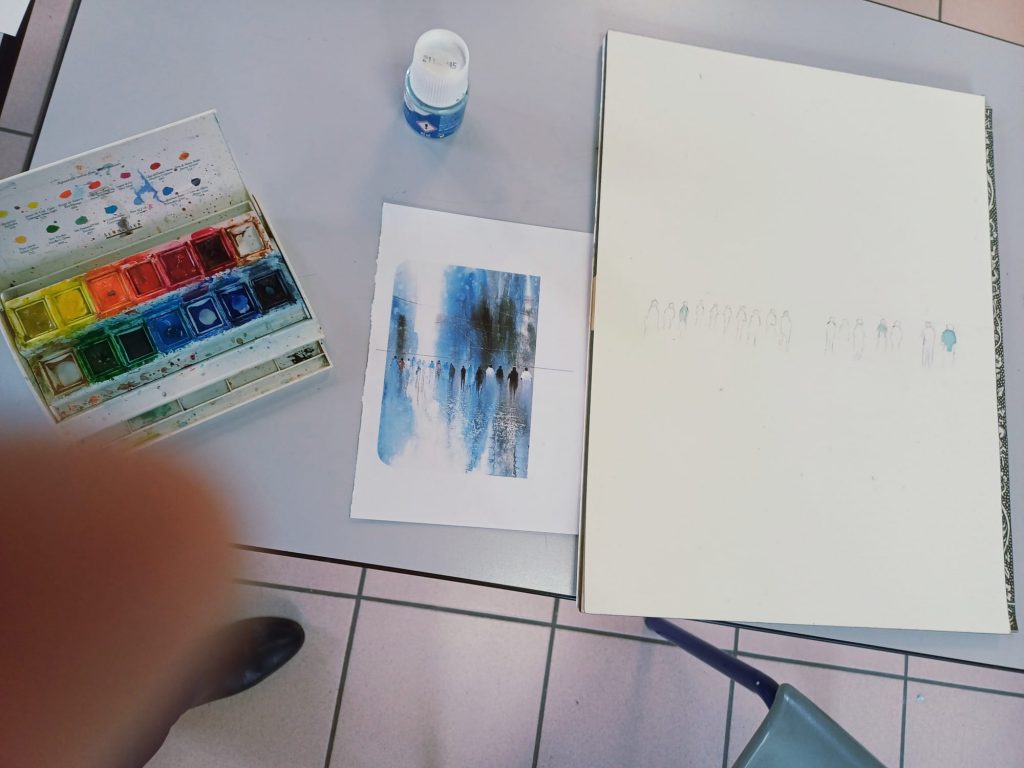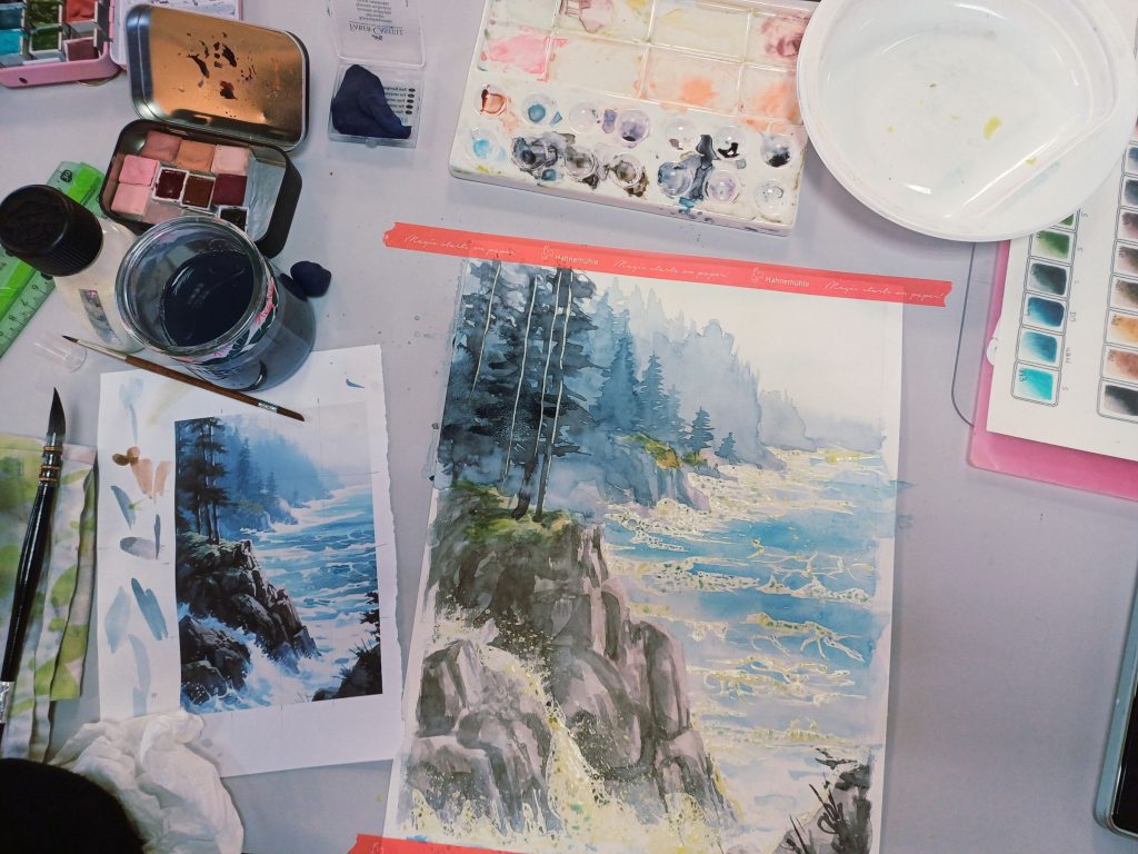 Vendredi 9 janvier 2026, le thème de l’atelier était le Drawing Gum. Nous avons employé cette technique pour préserver les blancs de l’aquarelle. Un travail réalisé par étape : dessin, pose du drawing gum à la plume ou au pinceau, temps de séchage, peinture à l’aquarelle, retrait du drawing gum, finalisation de l’aquarelle.