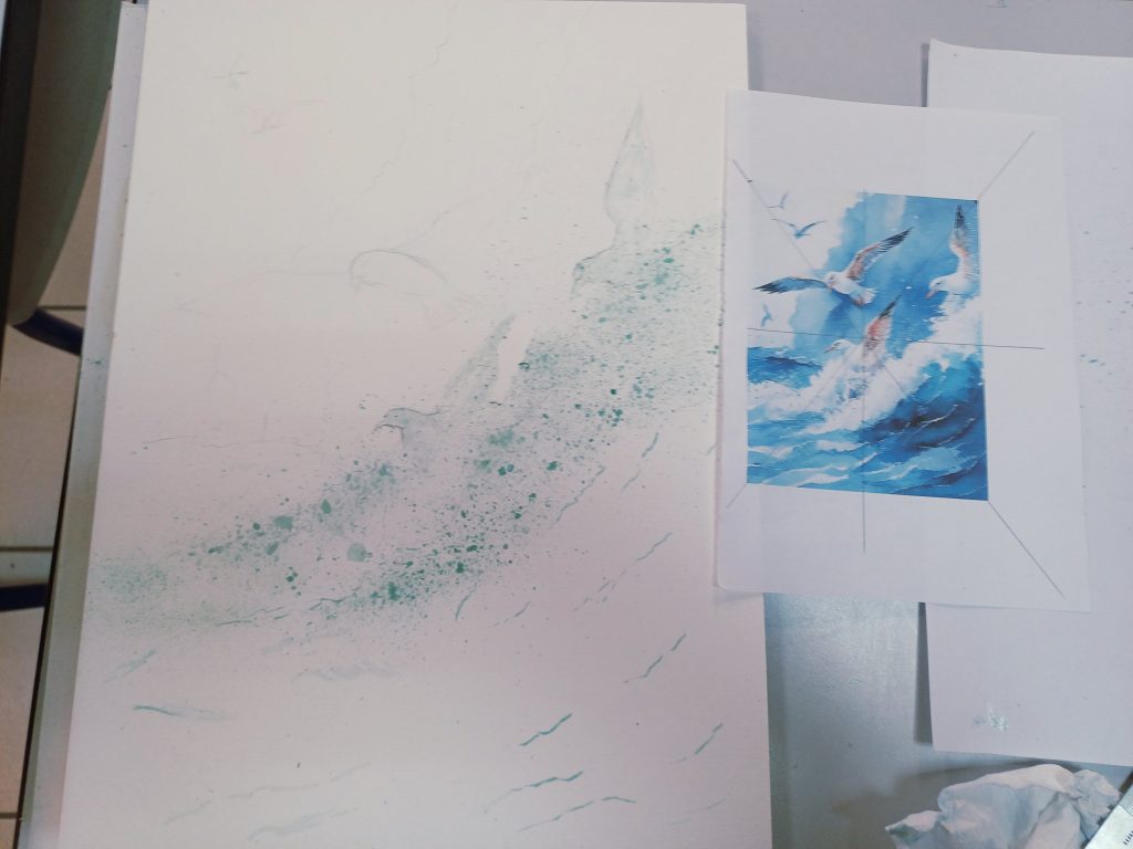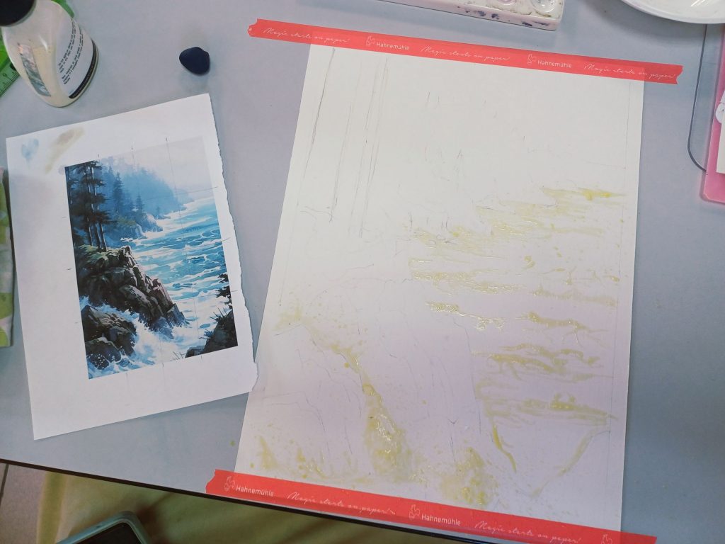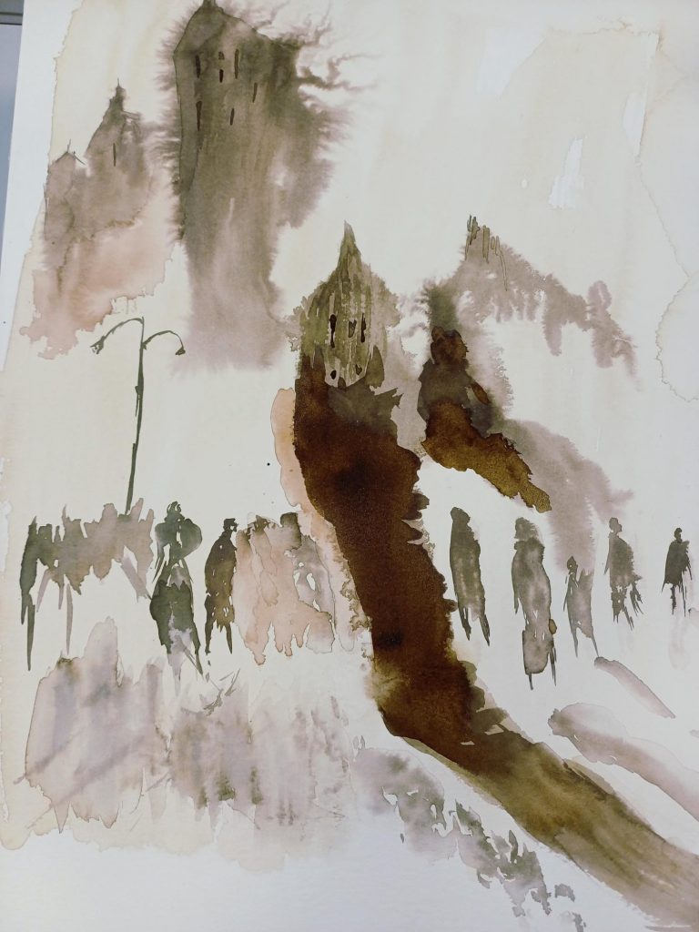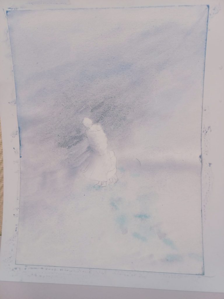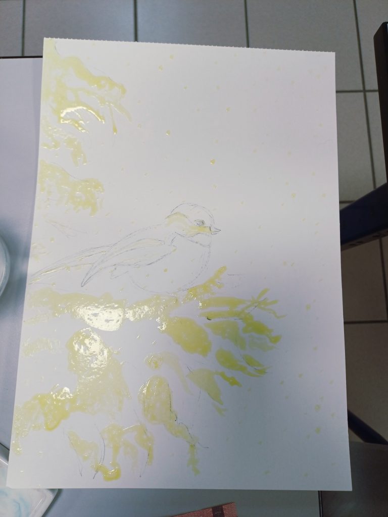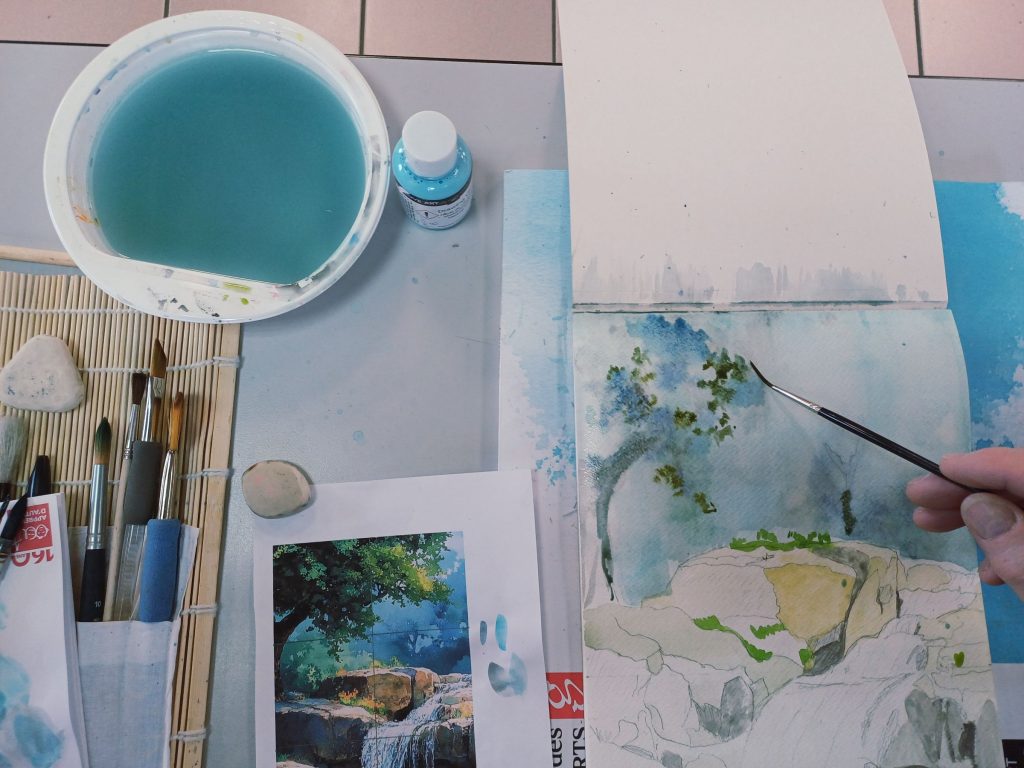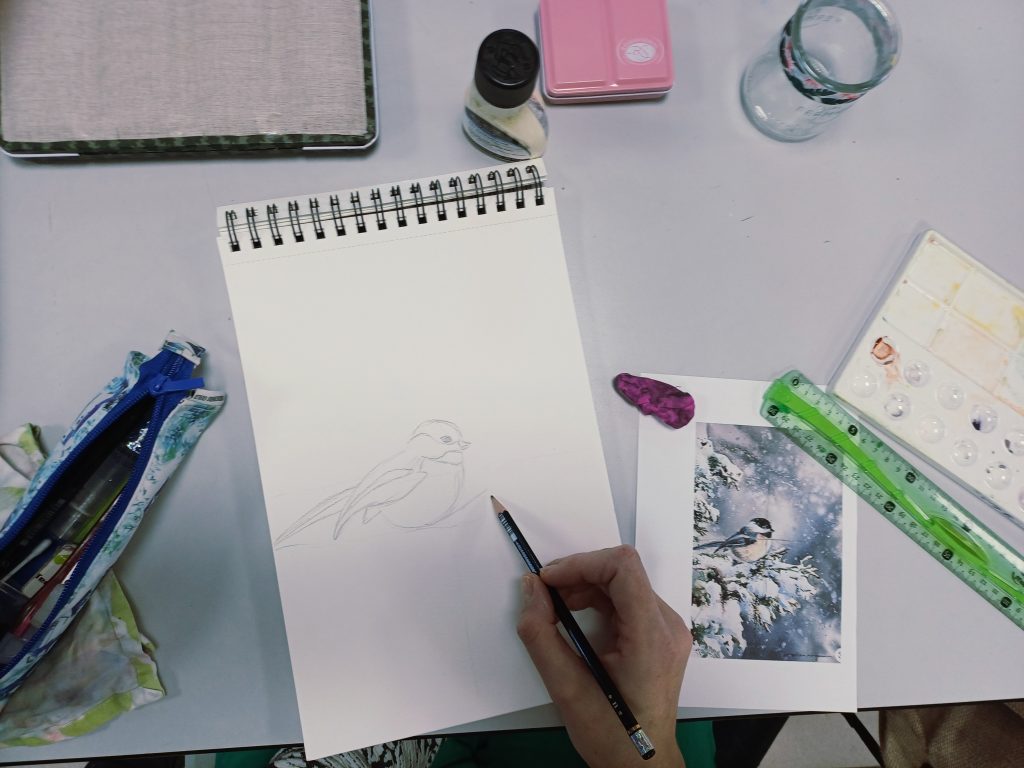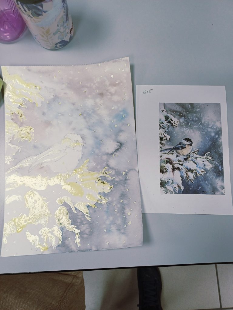 Vendredi 9 janvier 2026, le thème de l’atelier était le Drawing Gum. Nous avons employé cette technique pour préserver les blancs de l’aquarelle. Un travail réalisé par étape : dessin, pose du drawing gum à la plume ou au pinceau, temps de séchage, peinture à l’aquarelle, retrait du drawing gum, finalisation de l’aquarelle.