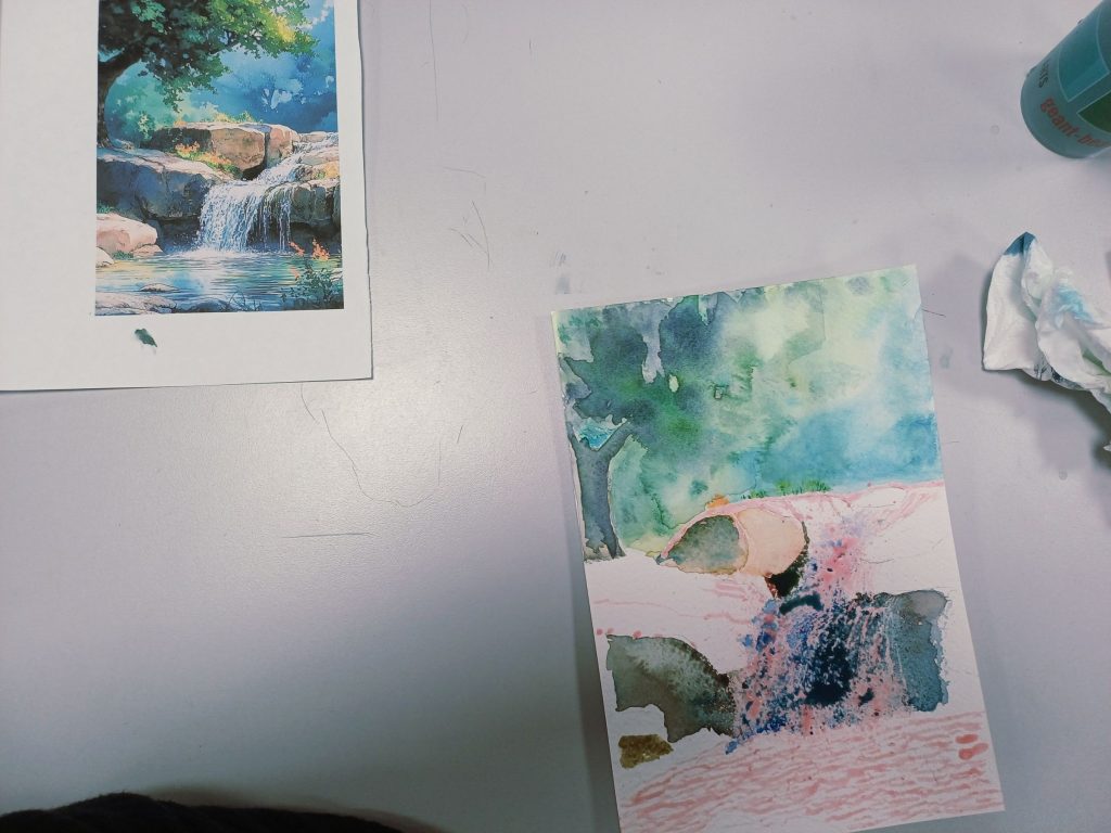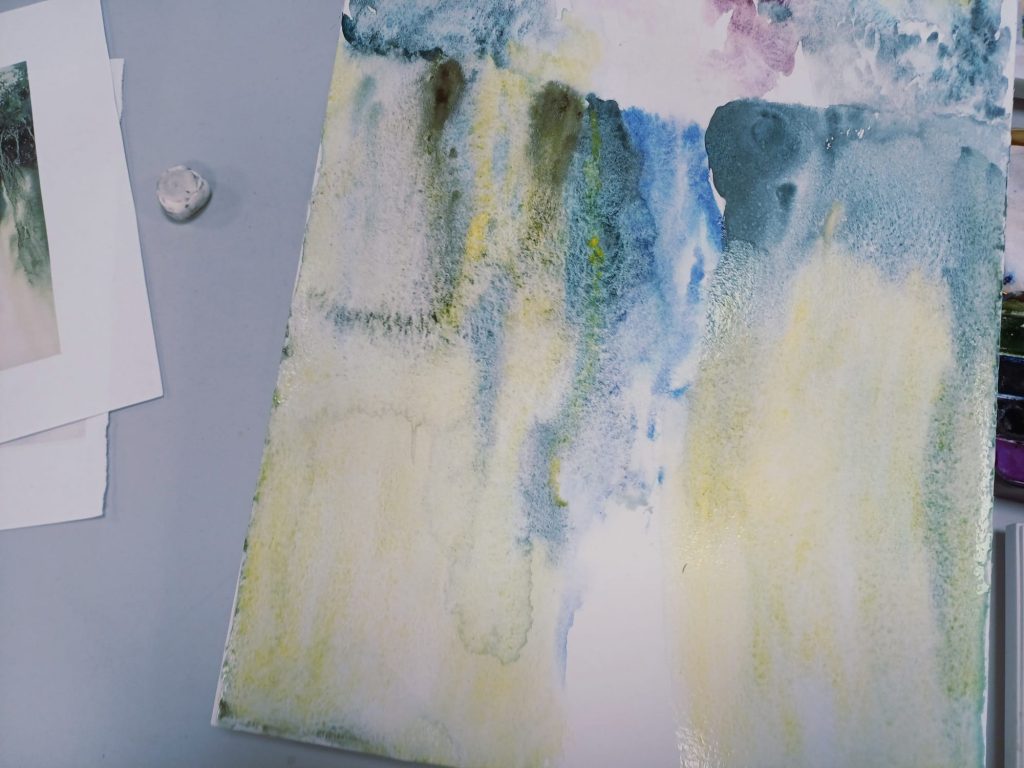 Vendredi 6 février 2026, nous avons joué avec la granulation des pigments. La granulation en aquarelle ajoute de la profondeur, de la texture. Pour obtenir l’effet granuleux souhaité trois facteurs clés entre en ligne : l’eau, le papier et la peinture que vous utilisez. En effet, la granulation est une propriété de certaines peintures dans laquelle les pigments s’accumulent en petits groupes une fois appliqués . Lorsqu’ils sont mélangés à l’eau, ces particules s’agglutinent dans la texture du papier plutôt que de se répandre uniformément. Les pigments granulés apparaîtront sous forme de petits points et/ou taches inégalement dispersés dans la couche de peinture.