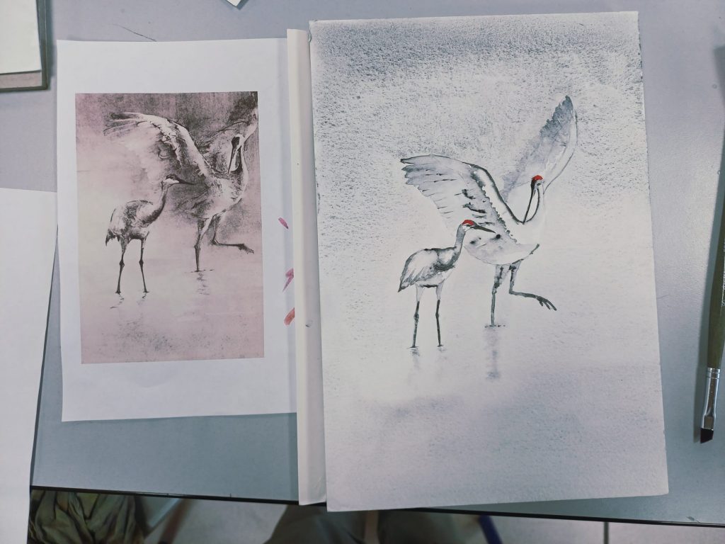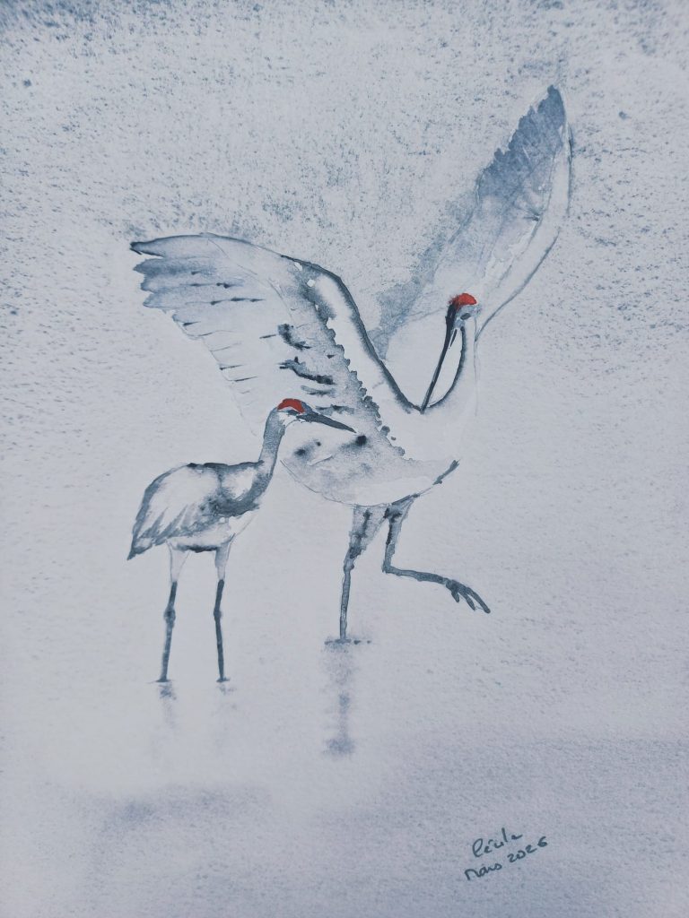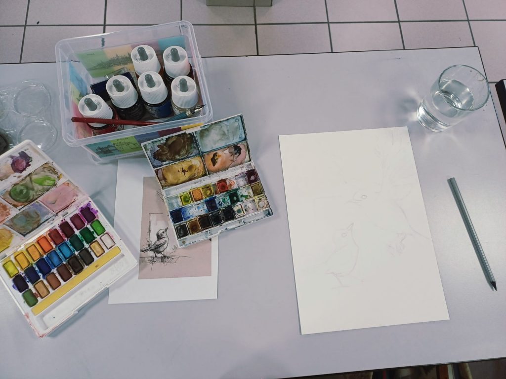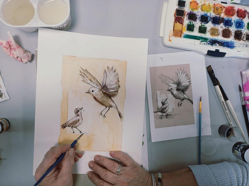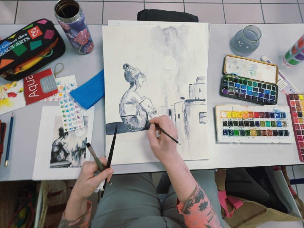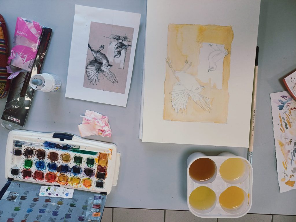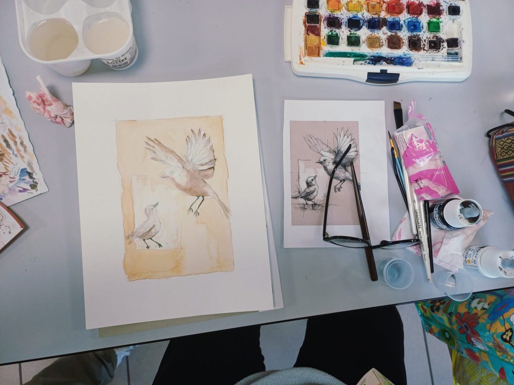 Vendredi 9 janvier 2026, le thème de l’atelier était le Drawing Gum. Nous avons employé cette technique pour préserver les blancs de l’aquarelle. Un travail réalisé par étape : dessin, pose du drawing gum à la plume ou au pinceau, temps de séchage, peinture à l’aquarelle, retrait du drawing gum, finalisation de l’aquarelle.