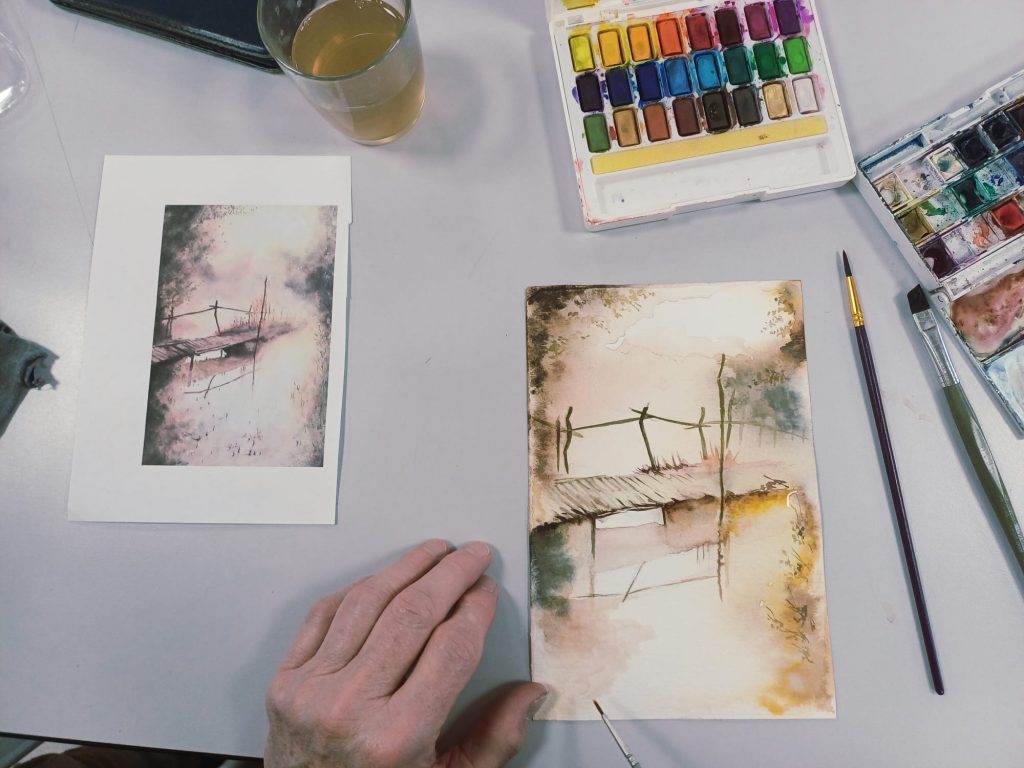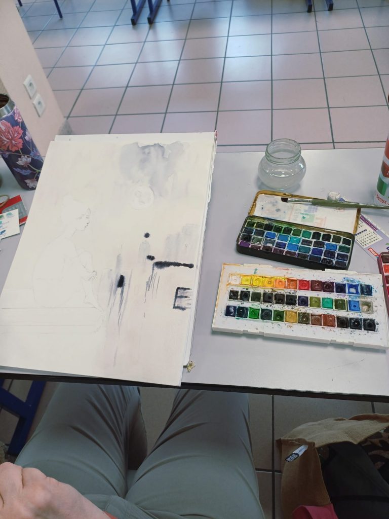 Vendredi 27 novembre, des adhérents ont réalisé des peintures en utilisant plusieurs techniques différentes : aquarelle, pastel sec, crayon aquarellable, encre, crayon à l’huile…..