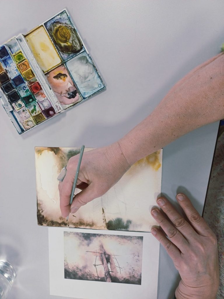 Vendredi 6 mars 2026, Michel Minon nous a accompagné dans la réalisation d’aquarelles monochromes en utilisant godets, tubes et encres aquarelle. Chacun s’est aventuré à sa manière et avec sa personnalité dans cet exercice.
